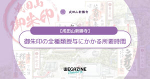成田山新勝寺の御朱印は、「大本堂、釈迦堂、光明堂、出世稲荷、醫王殿、平和大塔」の全部で6種類あります。御朱印を全種類授与してもらうのにかかる所要時間を紹介しています。
