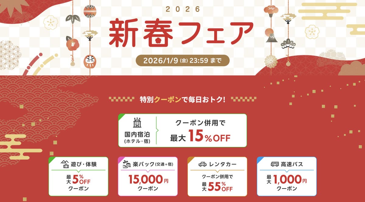 楽天トラベルの新春フェア開催(2026年1月9日まで)